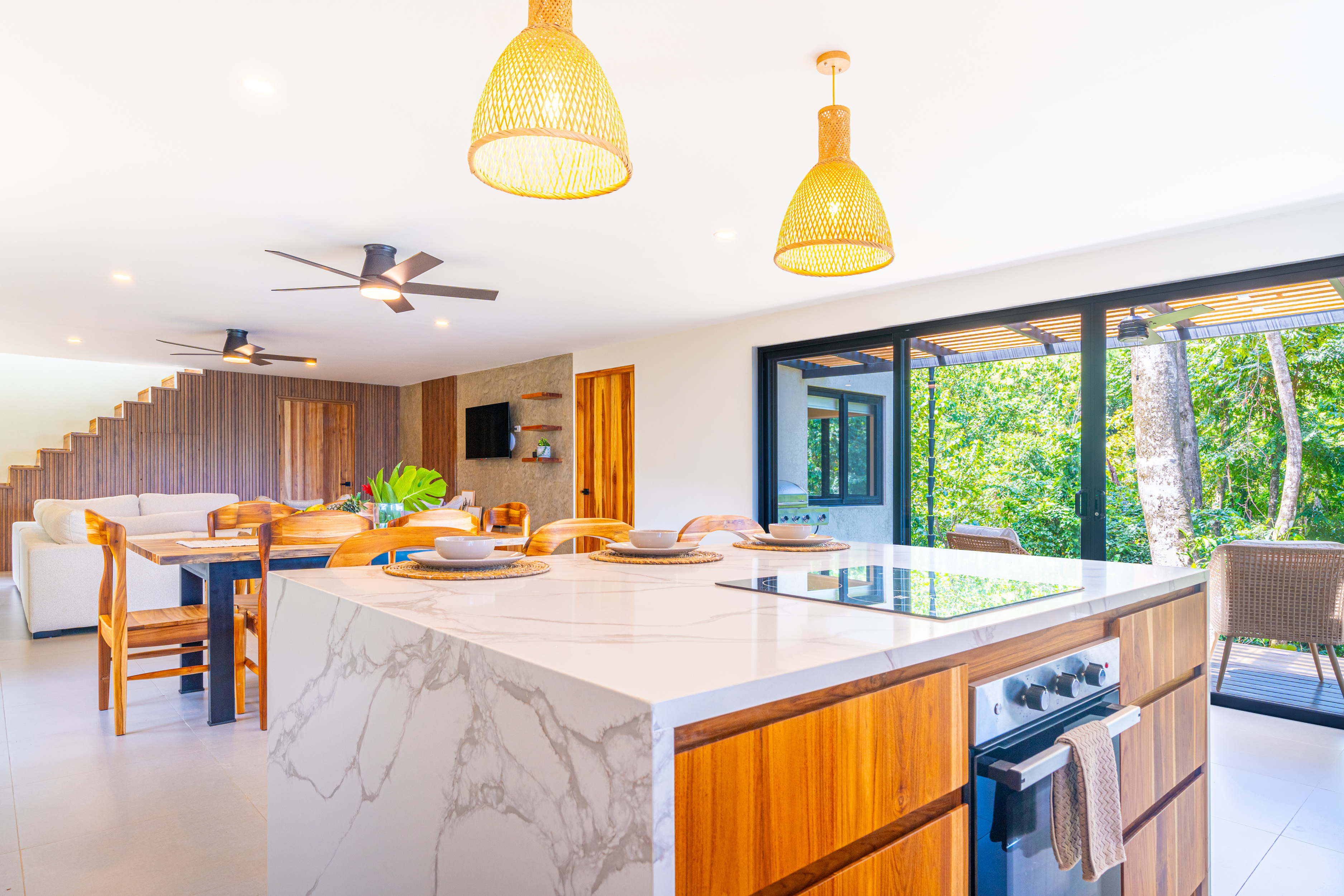 This project, located in Marina Vista, Dominicalito, was conceived to merge architecture and nature into a single harmonious language. With views that embrace both the ocean and the mountains, the home becomes a sensory retreat where the serenity of the sea meets the majesty of the tropical forest. Inspired by the Jungle Modern Design concept, we developed an architectural proposal that breathes freedom and natural elegance, complemented by thoughtfully designed furniture and a moodboard of fresh, light, and organic finishes that elevate the aesthetic and emotional experience of the space.