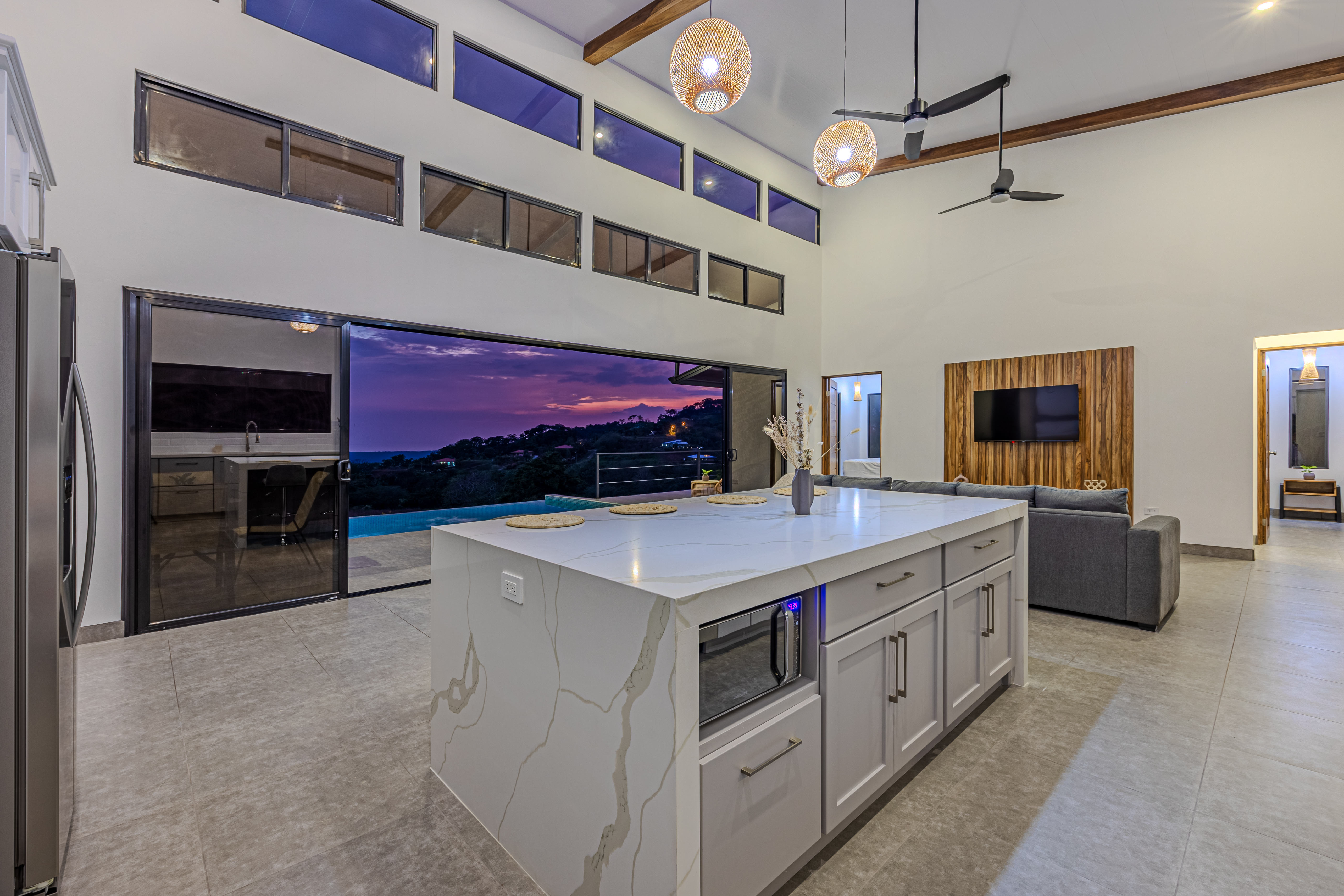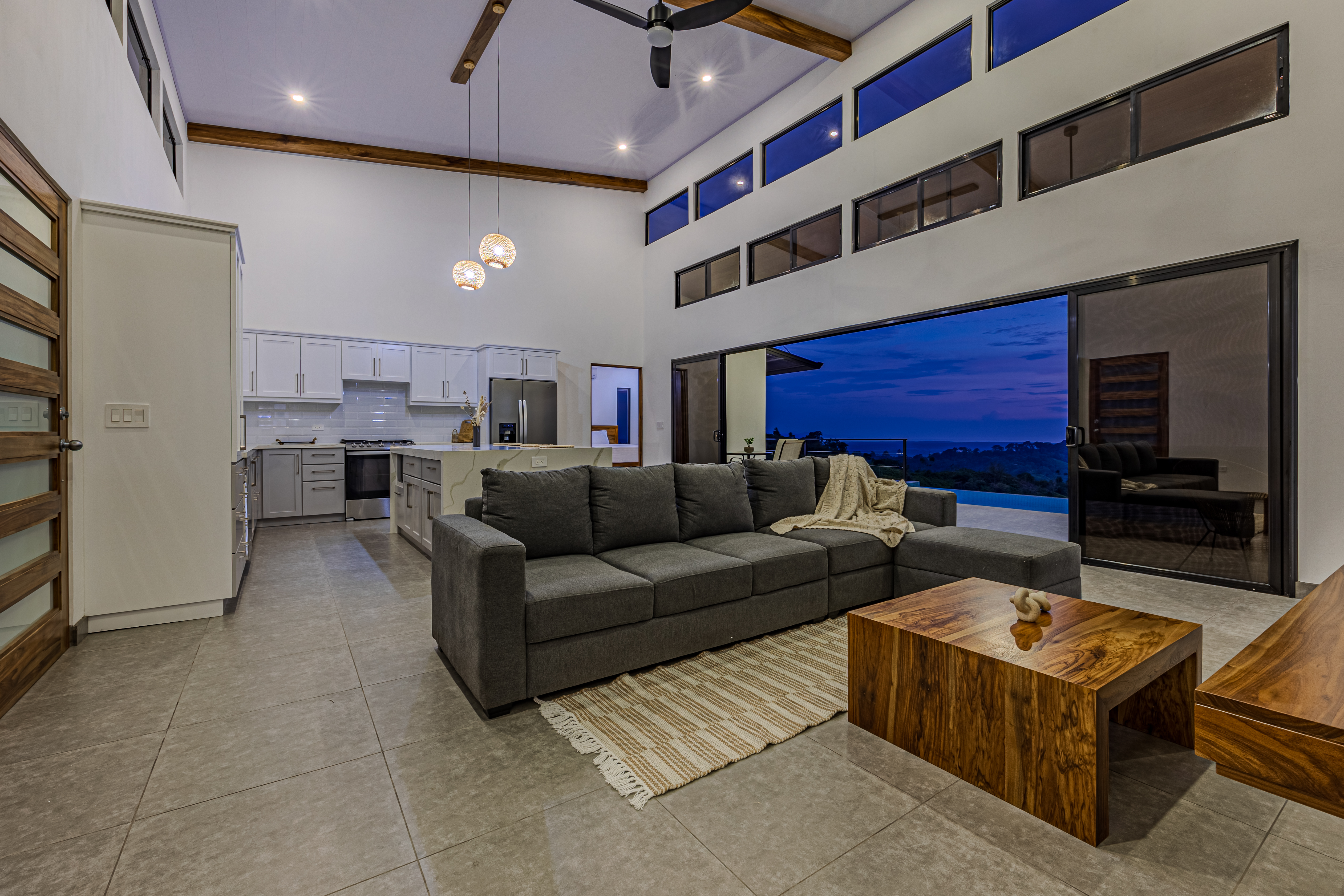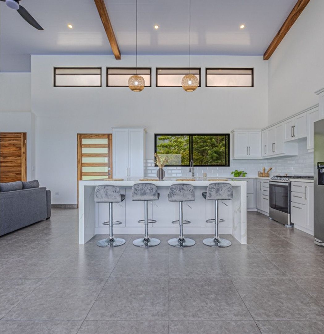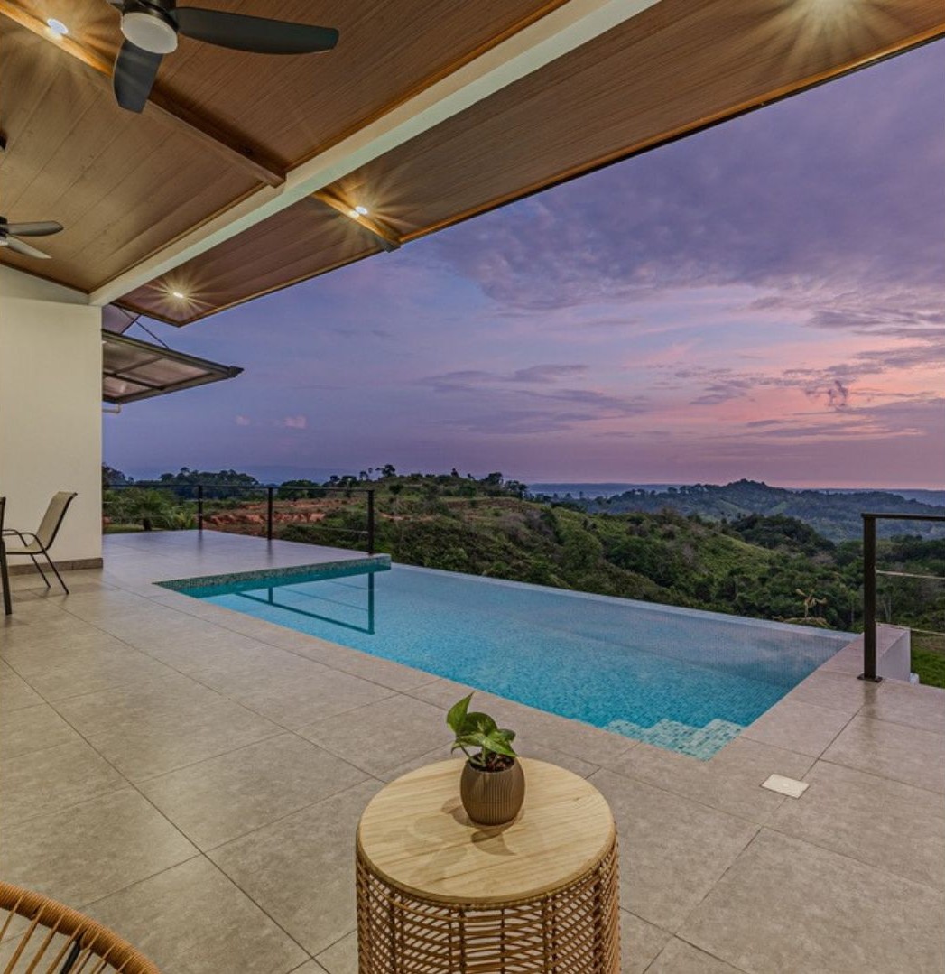 Casa Vista Linda, located in Chontales de Osa, has been architecturally designed to maximize the property's stunning views. The common areas, such as the kitchen and living room, are integrated with the terrace and pool, and each of the bedrooms offers ocean views. As the name suggests, most of the spaces provide access to a "Vista Linda" The standout finishes include polished concrete to accentuate the main walls, while the rest of the house features neutral colors like white with black details. For the selection of interior details, a color palette ranging from gray to white has been chosen, with accent materials such as wood for some furniture, and wicker and bamboo for lamps and certain decorative elements. Undoubtedly, the residents of this house will experience a unique connection with nature from every one of its spaces.
