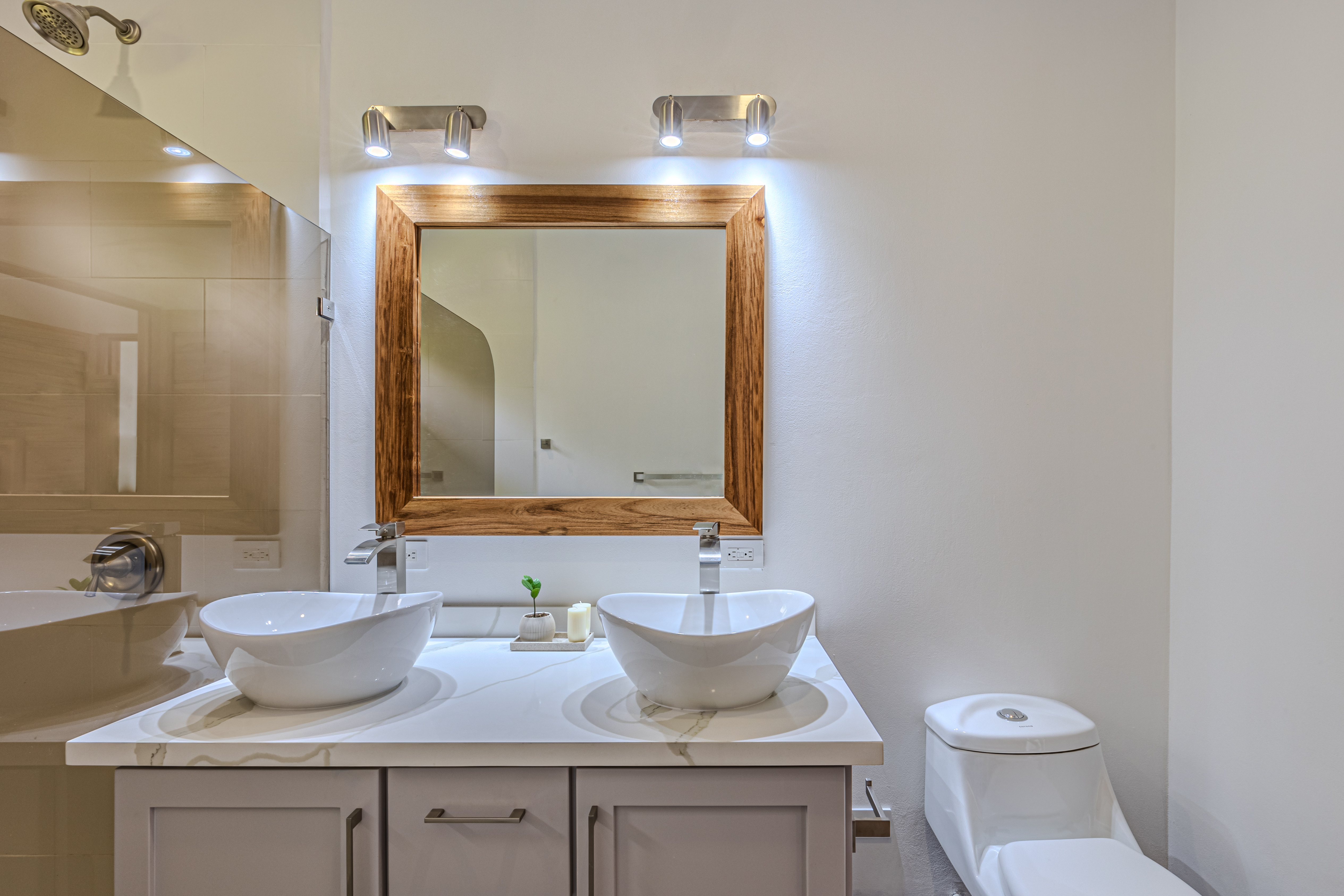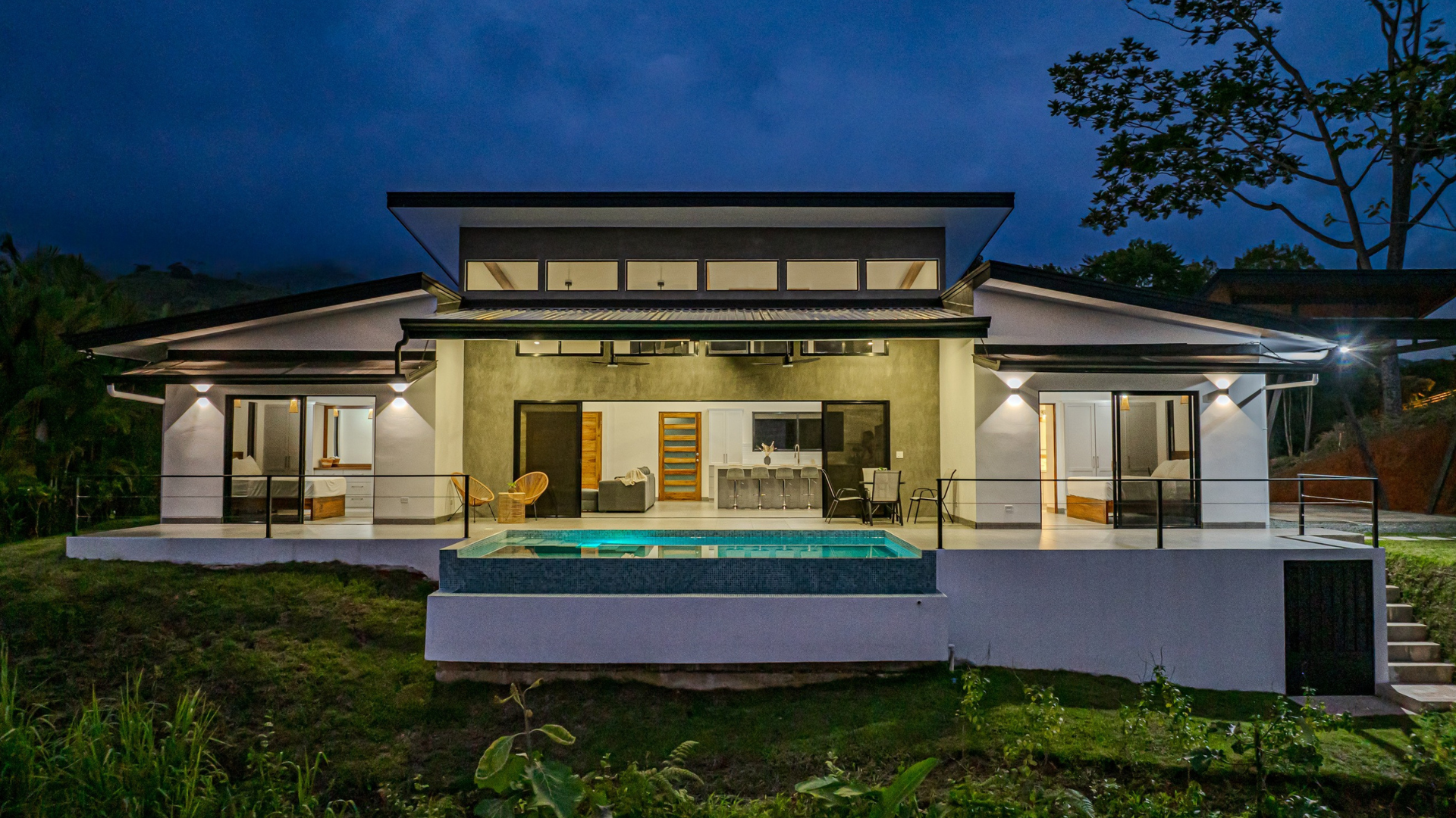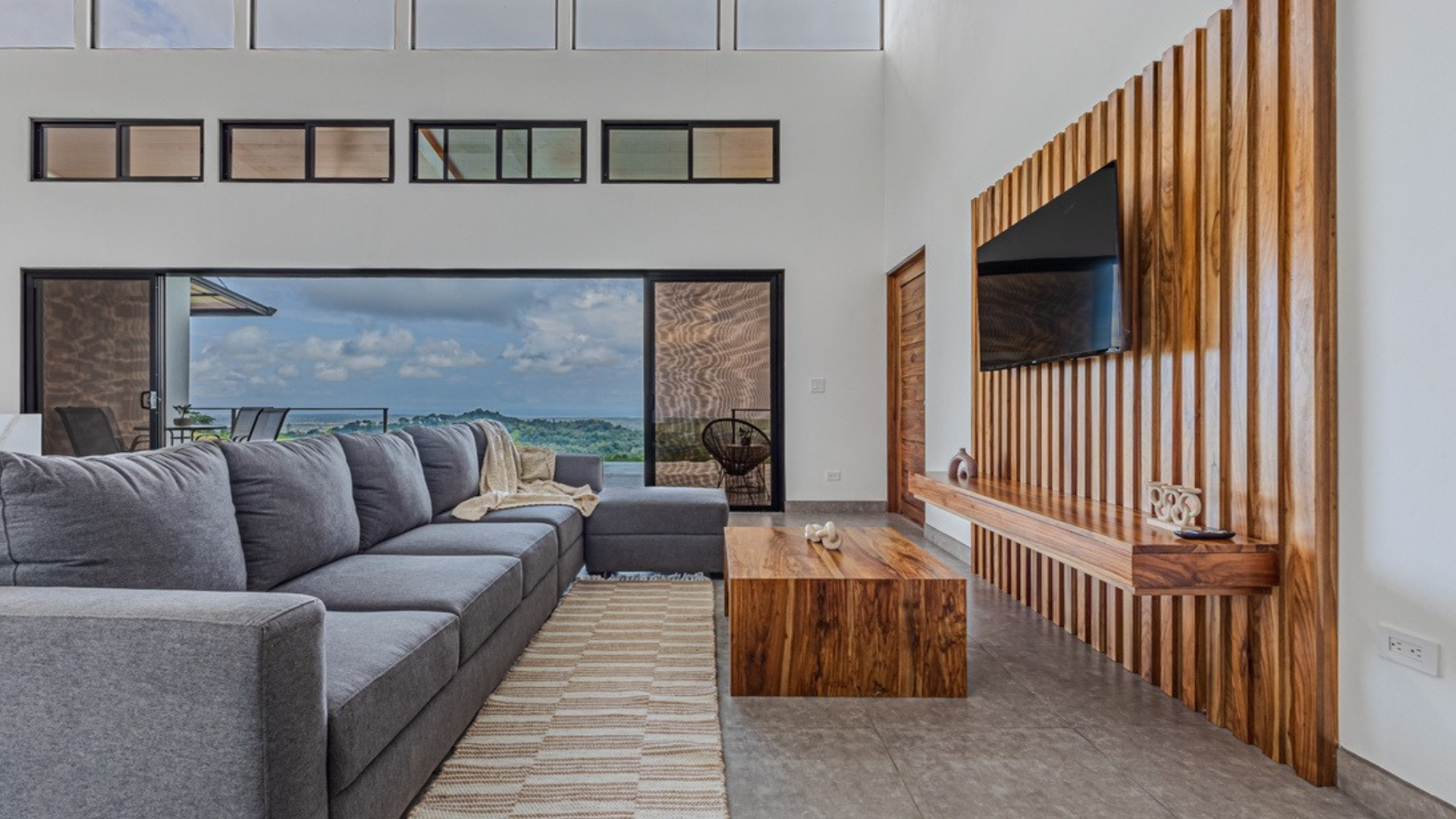 Casa Vista Linda, located in Chontales de Osa, has been architecturally designed to maximize the property's stunning views. The common areas, such as the kitchen and living room, are integrated with the terrace and pool, and each of the bedrooms offers ocean views. As the name suggests, most of the spaces provide access to a "Vista Linda" The standout finishes include polished concrete to accentuate the main walls, while the rest of the house features neutral colors like white with black details. For the selection of interior details, a color palette ranging from gray to white has been chosen, with accent materials such as wood for some furniture, and wicker and bamboo for lamps and certain decorative elements. Undoubtedly, the residents of this house will experience a unique connection with nature from every one of its spaces.